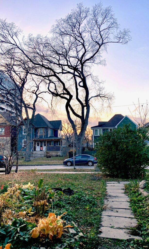 When I took the 2008 picture of the “dancing elm”, its branches interlaced with the branches of 10 other trees on the boulevard and in my yard to create an intricate canopy of branches over my head. Nine of those 11 trees are now gone, and when the dancing elm and its neighbour (also marked with the red dot) are cut down, the sky above my head, which used to be a sea of waving branches, will be nothing but bare sky.