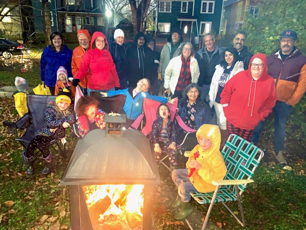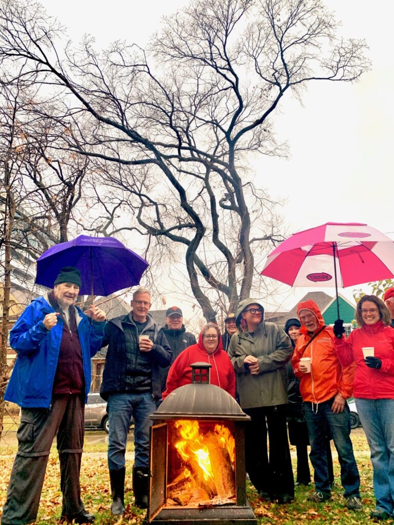 One by one, many holding umbrellas aloft, neighbours arrived to celebrate the trees. Members of my Buddhist group helped build the fire. Samantha, of the West Broadway Tenants’ Committee, and well-known for never venturing out into foul weather, arrived. Chantale and Irene and a friend from Balmoral arrived, and, sheltering under an umbrella, started cooking hot dogs on the grill. Wolseley resident and tree champion Jim Palmquist arrived. Friends like Terese and Virginia arrived.